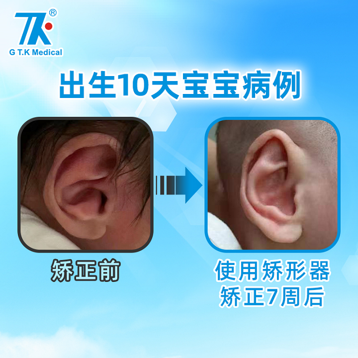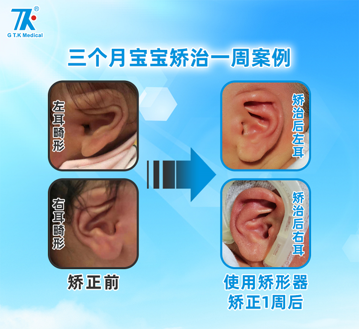 其实,原理就是新生儿刚出生,携带了母体的高浓度雌激素,雌激素中有一种透明质酸,让宝宝的耳廓骨头比较柔软,具备良好的延展性和收缩性,再使用耳廓矫形器,对耳廓进行收缩或者牵拉,就能很好的矫正耳廓形态,让宝宝拥有完美健康的耳廓。也因为,宝宝从出生到六周内,雌激素含量都是比较高的,因此,一般选择在出生3天到30天之内进行矫正,且越早矫治效果越佳。